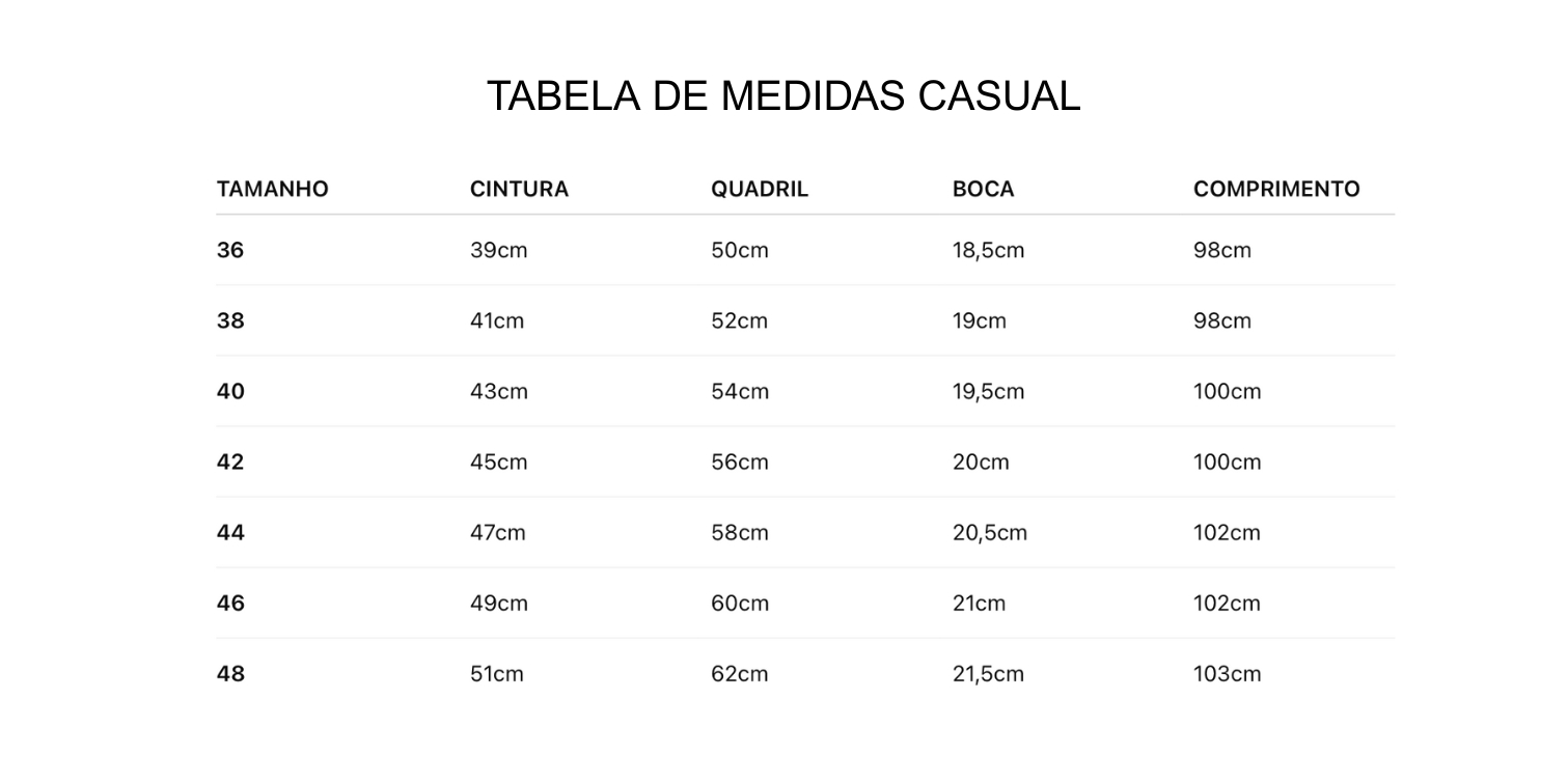 - Consulte a tabela de medidas nas fotos do produto ou na aba “Guia de medidas”